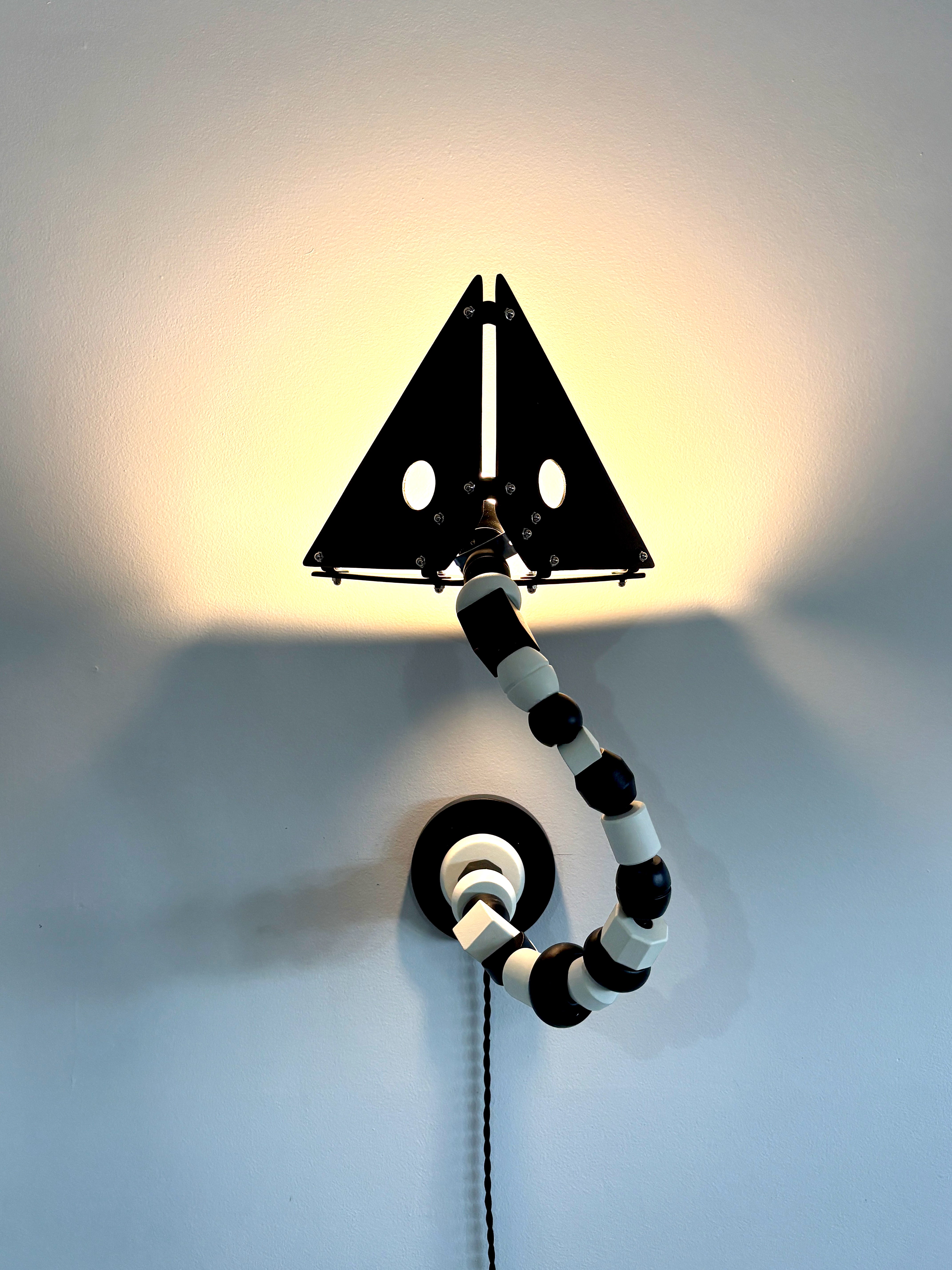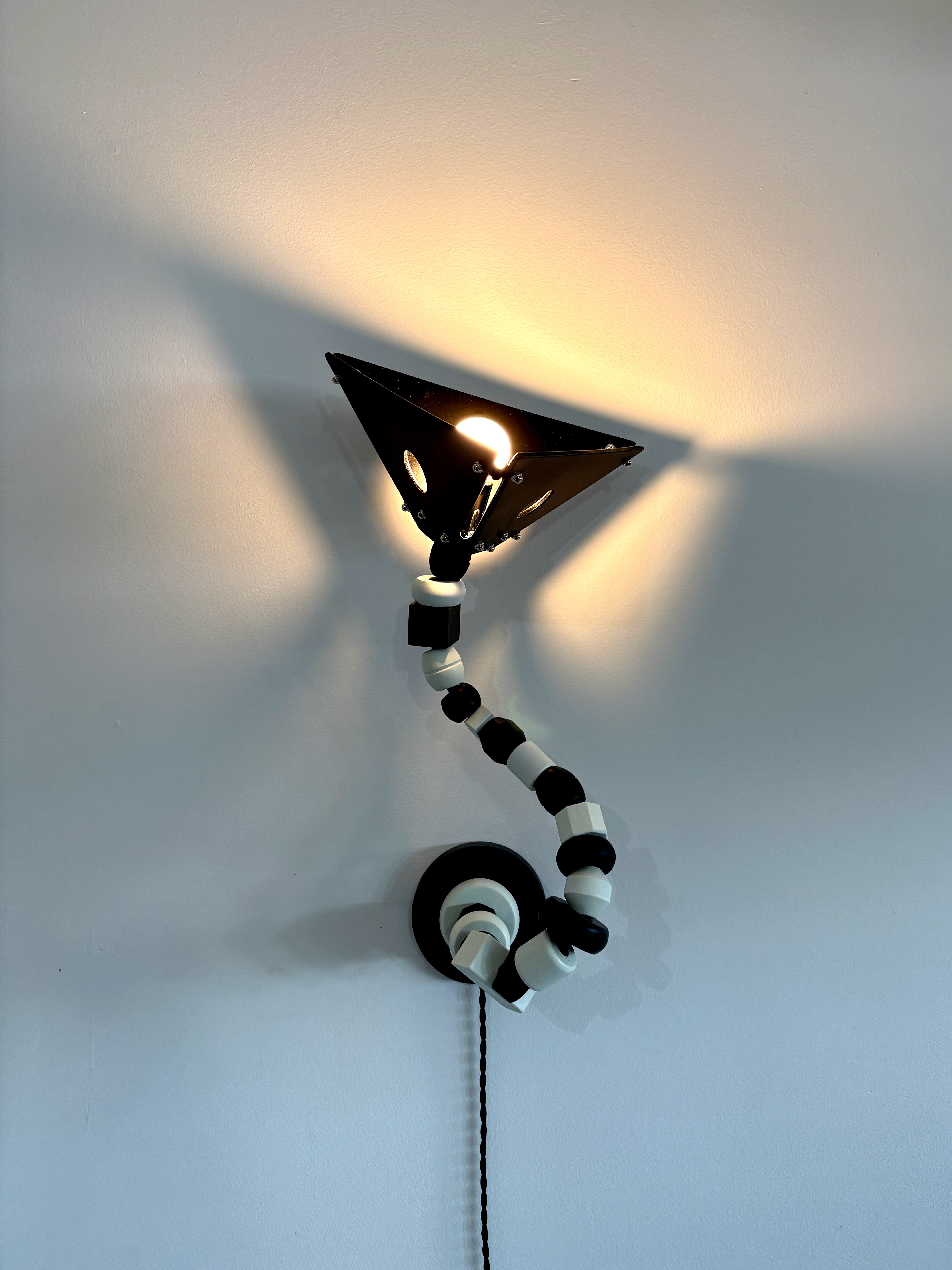 The Bead Maze Lamp is of course inspired by the bead maze toys from childhood. A series of painted wooden beads form the stem, threaded along a bendable steel arm that allows the lamp to be shaped and repositioned freely. It functions as either a table lamp or a wall-mounted sconce.