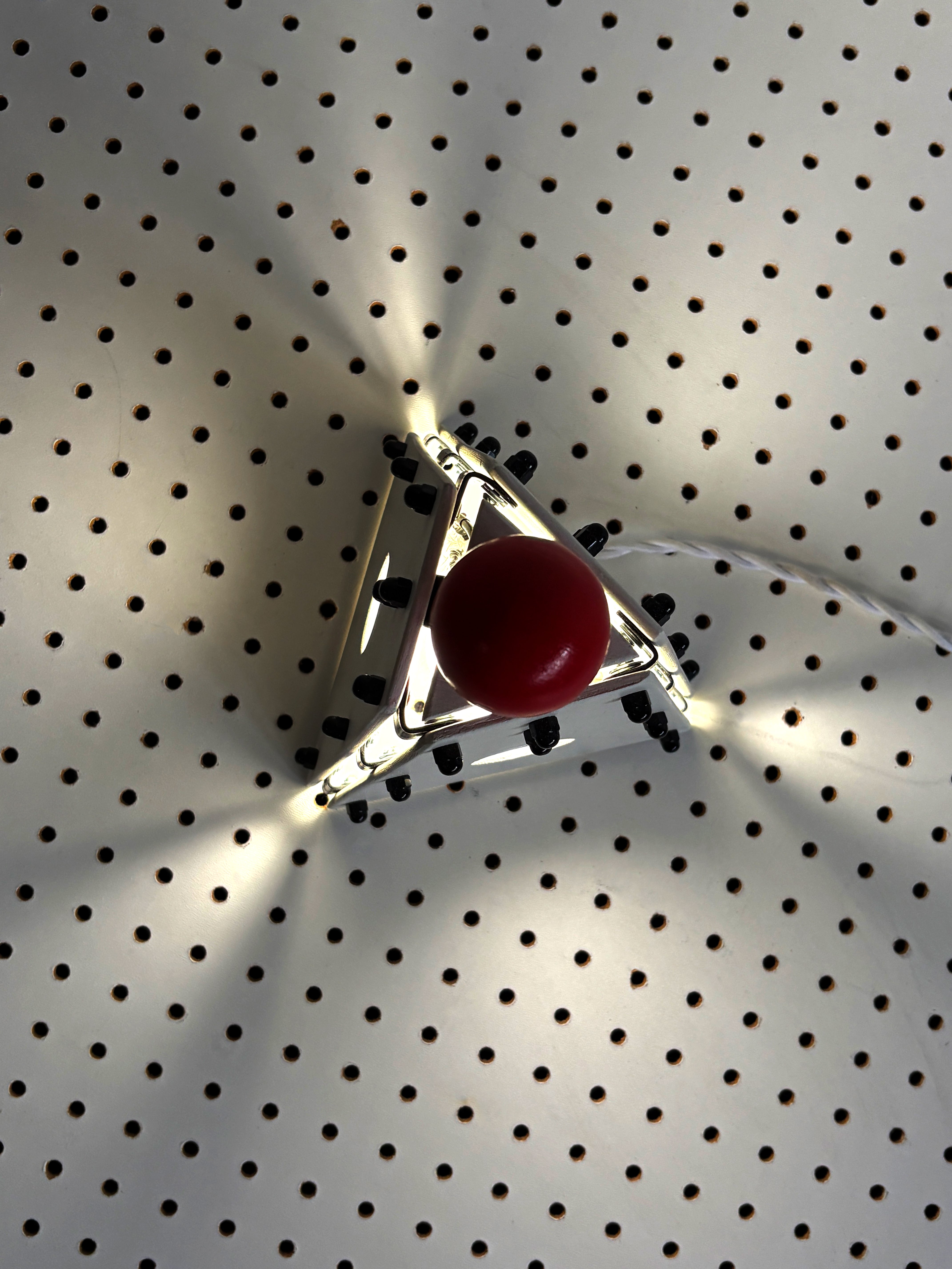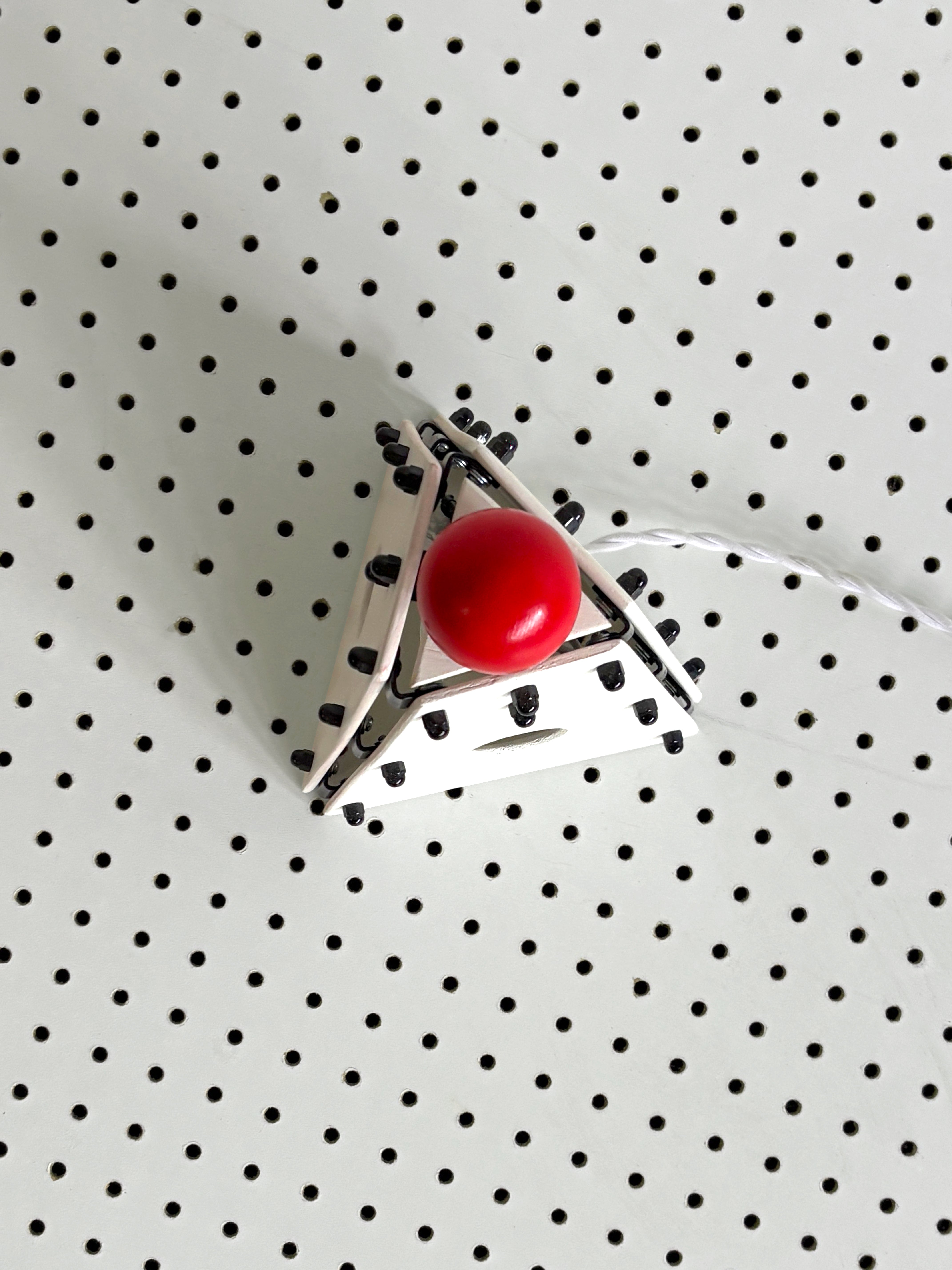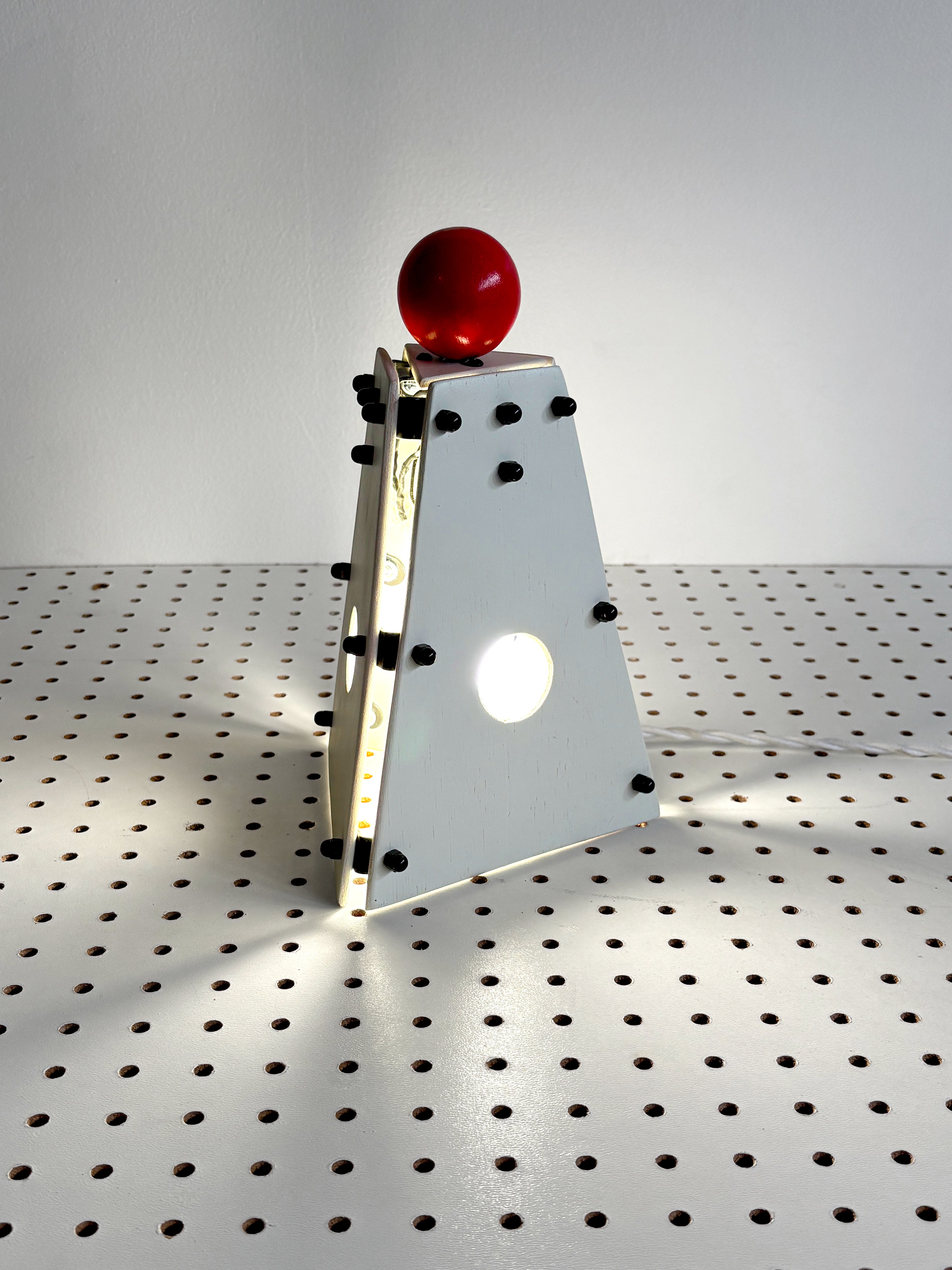 The Red Nose Table Lamp is a compact sculptural light built from painted wood panels and exposed hardware, topped with a clown-red ball switch that sits proudly on top, giving the piece a slightly mischievous character. The red ball functions as a dimmer switch, allowing the brightness to be adjusted with a simple twist.