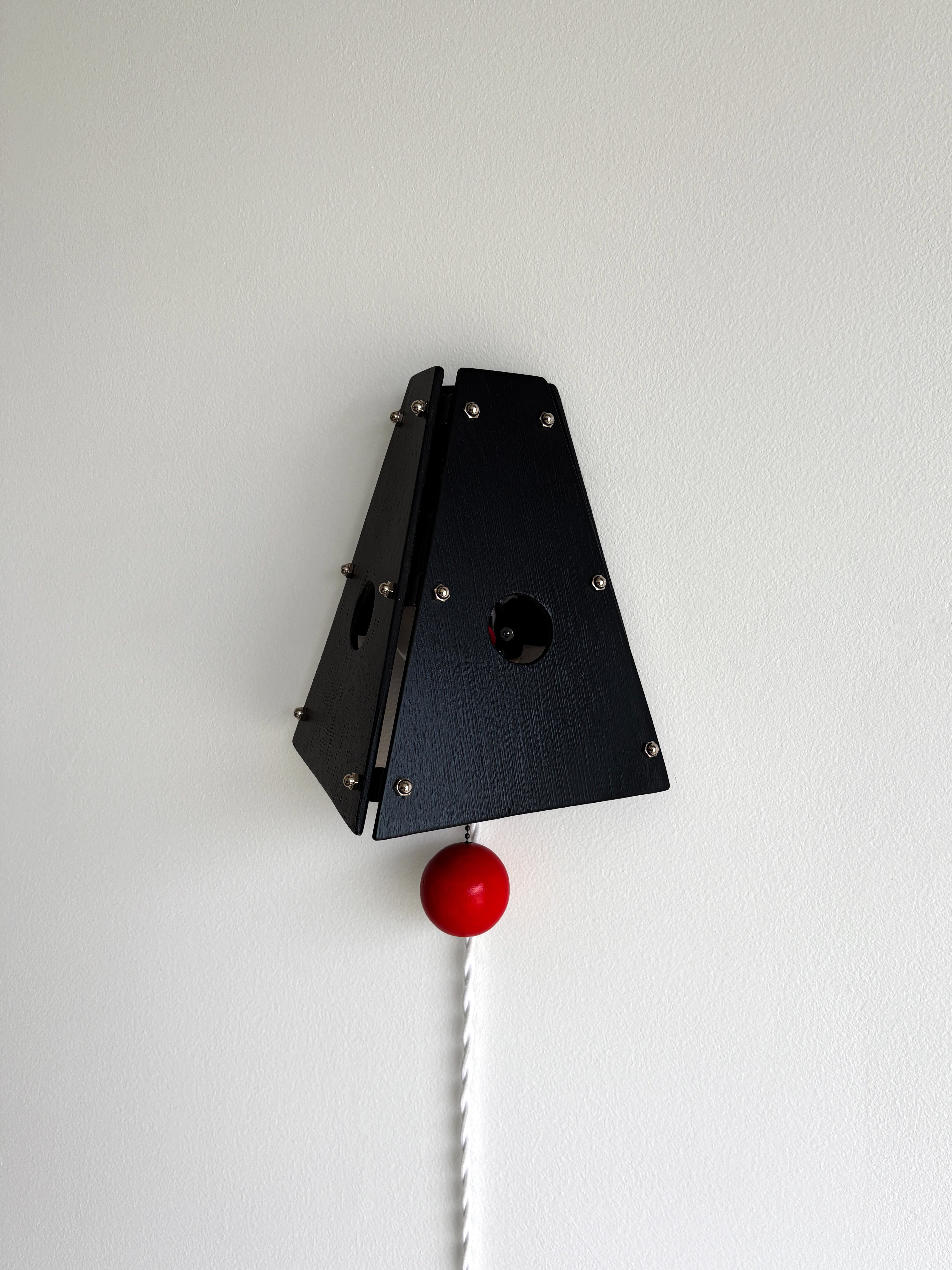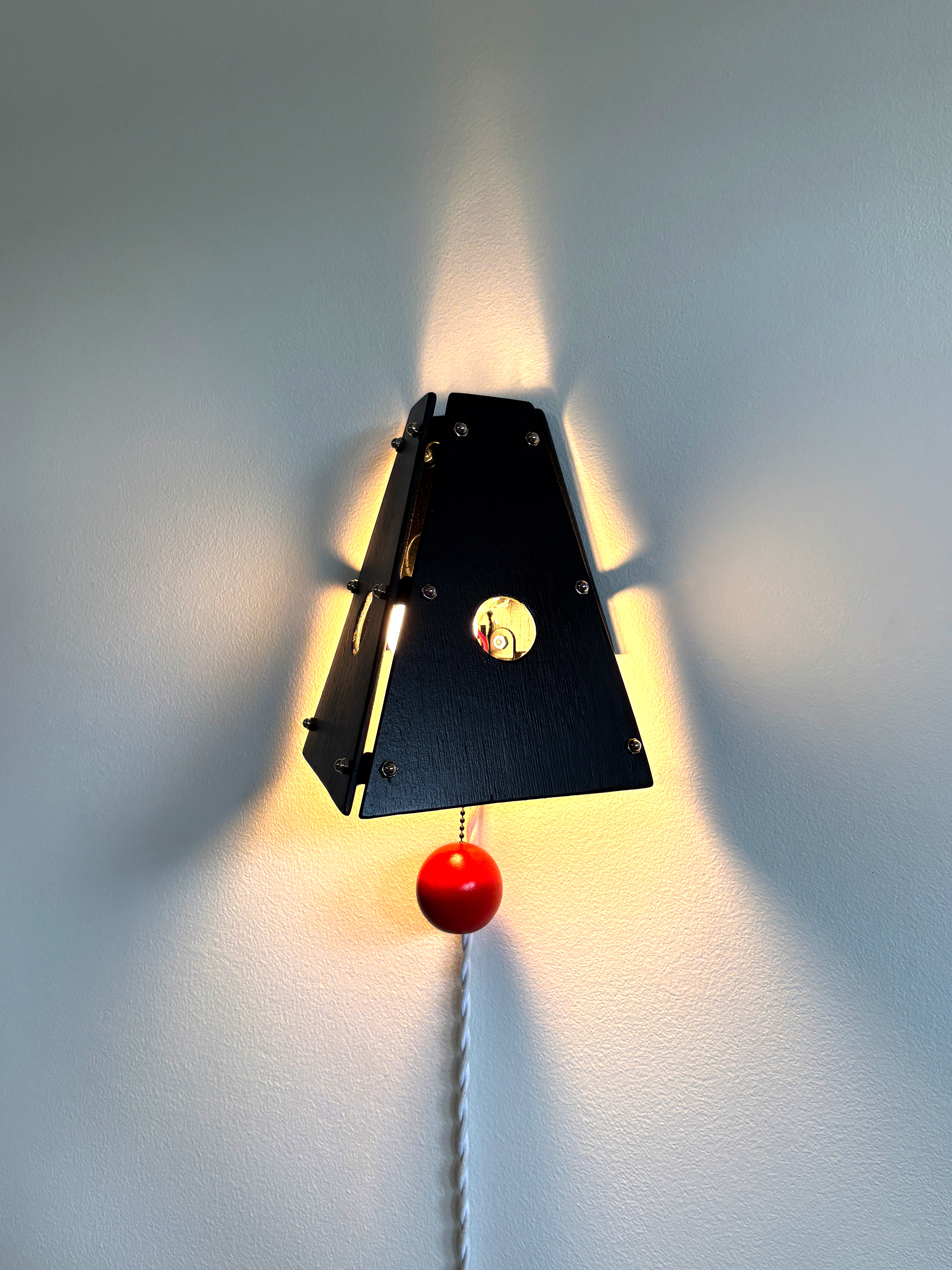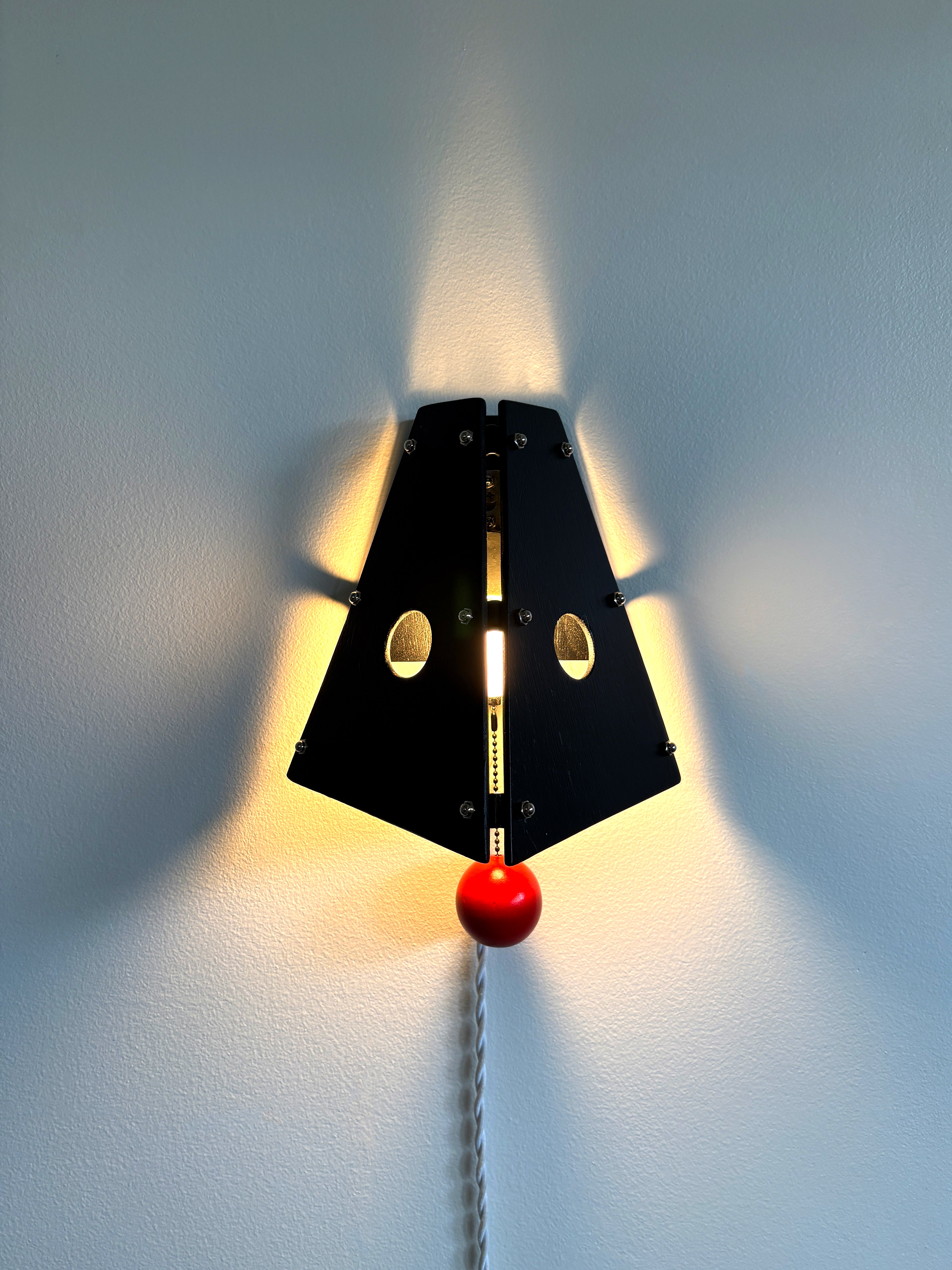 The Block Sconce draws from childhood memories of building with simple wooden blocks. Two painted wood panels form a geometric shade, joined with exposed hardware and a pull-chain switch that gives the piece a playful, slightly mechanical character.
