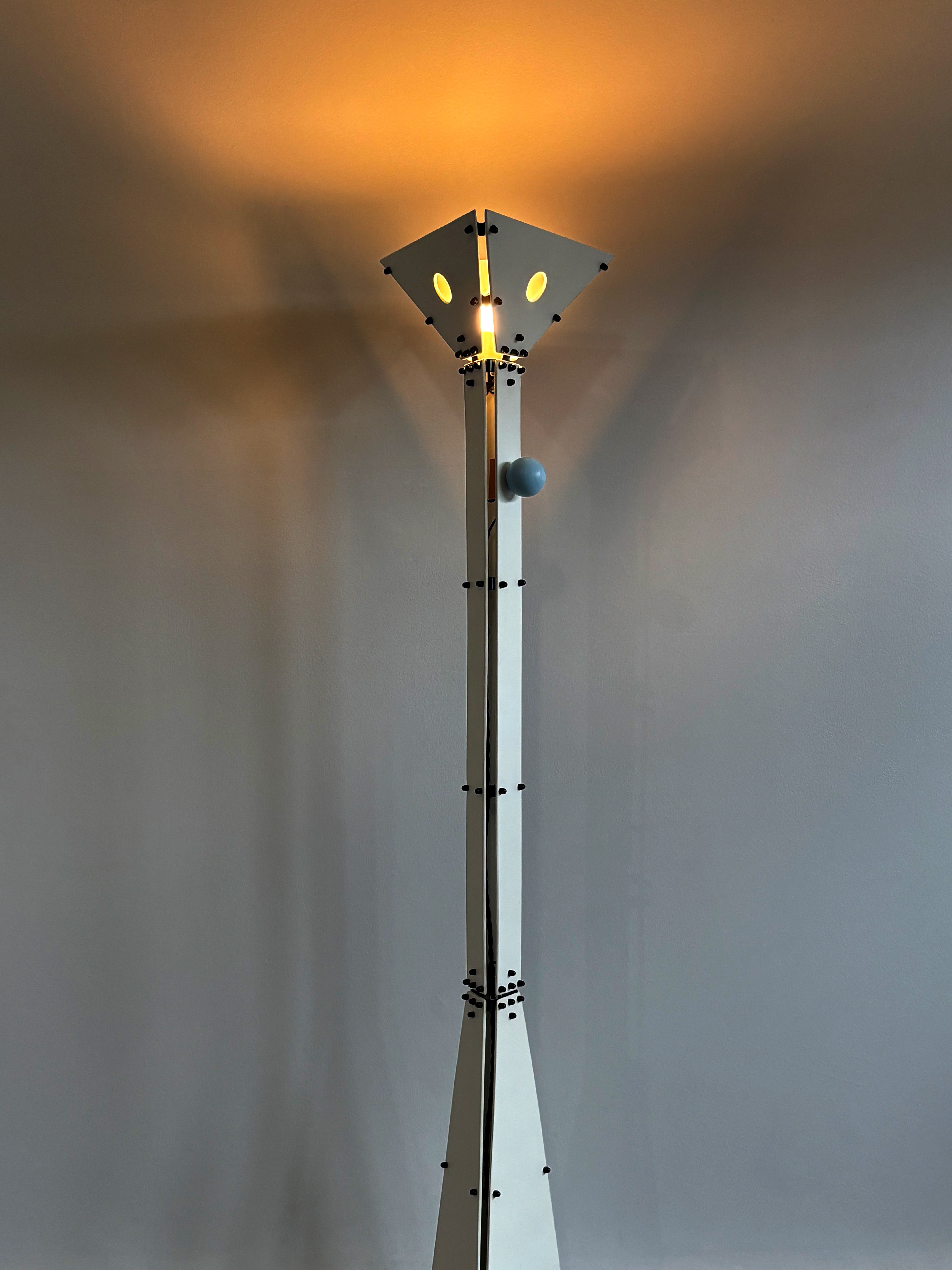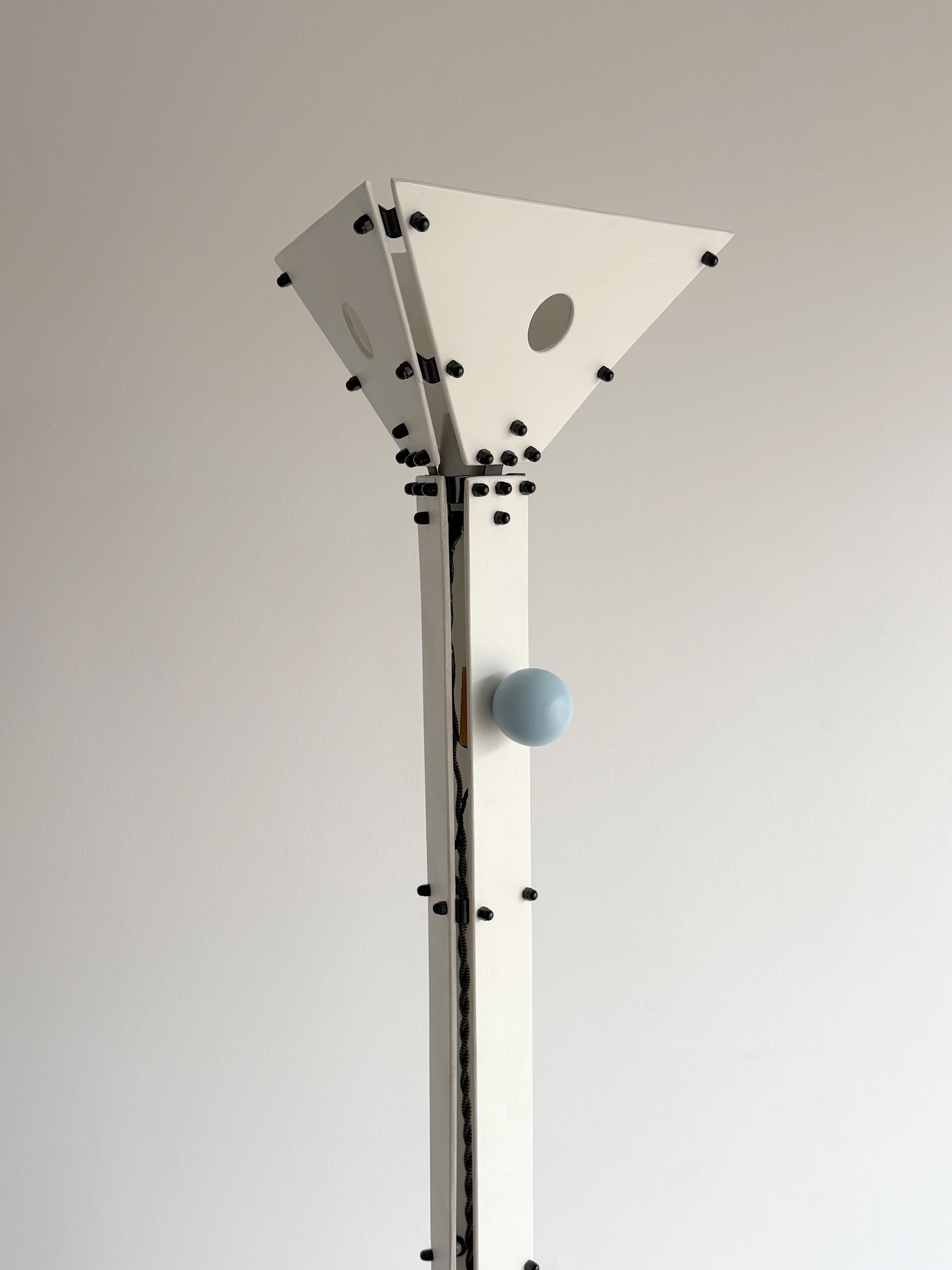 The Tulip Floor Lamp is a tall sculptural light built from simple geometric shapes. Painted wood panels taper upward from a wide base into a flared shade, creating a silhouette that feels playful, nostalgic, and slightly architectural. The red ball dimmer switch adds a playful pop of color.